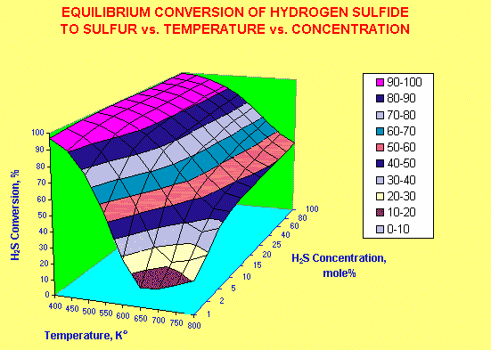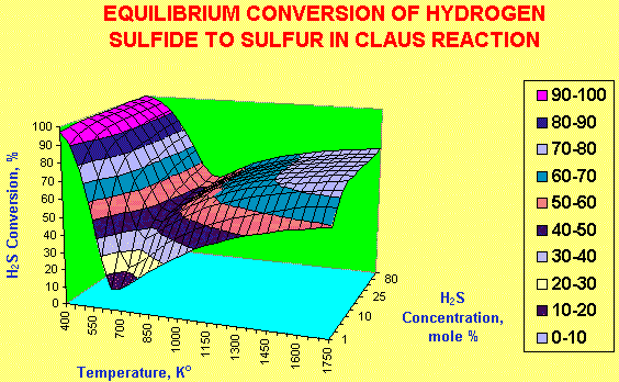 For the first time in sulfur recovery technology Dr. Tofik K. Khanmamedov expressed the relationship between equilibrium conversion of hydrogen sulfide to sulfur (nH2S + n/ 2O2 ↔ Sn + nH2O), temperature and concentration of hydrogen sulfide in the acid gases by using 3D graph technique. This new approach helps to understand the unique and complicated thermodynamic of the process of hydrogen sulfide oxidation to sulfur.